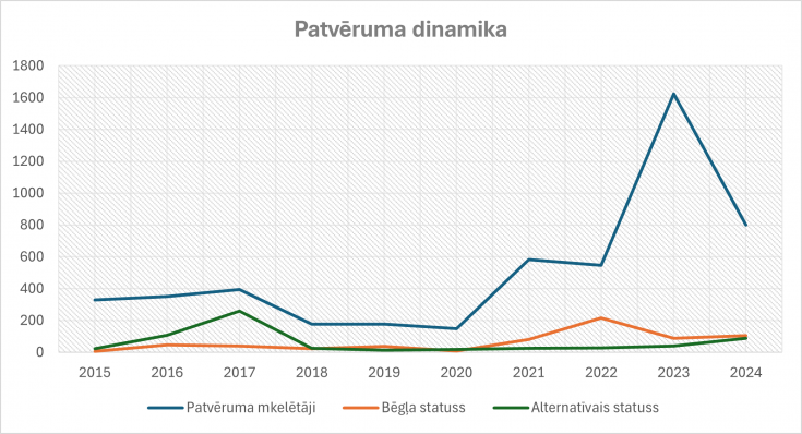 Grafiks nr. 7. Patvēruma dinamika 2015-2024. Avots: Pilsonības un migrācijas lietu pārvalde. Pieejams: https://www.pmlp.gov.lv/lv/patveruma-mekletaju-statistika