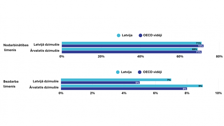 Imigrācijas jautājumi nav atrauti no integrācijas politikas. Mehānismi un pakalpojumu kopums, kas nosaka latviešu valodas apguvi, iekļaušanos darba tirgū, izglītības sistēmā u.c. jomās, ir būtiski veiksmīgai jaunatbraucēju integrācijai. Migrantu integrācijas politikas indekss (MIPEX), kura mērķis ir dot priekšstatu par jaunatbraucēju iespējām piedalīties sabiedrības dzīvē, Latviju ierindo pēdējā vietā ES. Raksta kontekstā būtiski izcelt divas MIPEX vērtētās jomas: izglītību (26 no 100 punktiem), darba tirgus mobilitāti (33 no 100 punktiem). Darba tirgus mobilitātes kontekstā viens no izaicinājumiem saistīts ar mērķētu pasākumu trūkumu integrācijai darba tirgū, kamēr izglītības jomā trūkst sistēmiska ilgtermiņa atbalsta. OECD dati par nodarbinātību liecina, ka jaunatbraucēju nodarbinātības līmenis Latvijā ir nedaudz zem OECD vidējā (Latvijā 69%, OECD vidēji 71%). Par vienu procentpunktu zemāks ir arī vietējo iedzīvotāju nodarbinātības līmenis, salīdzinājumā ar OECD vidējo. Bezdarba līmenis gan vietējiem iedzīvotājiem, gan jaunatbraucējiem ir virs vidējā OECD (sk. grafiku nr. 10). Vadoties pēc OECD datiem, jaunatbraucēju nodarbinātības līmenis ir nedaudz zemāks un bezdarba līmenis ir nedaudz augstāks, salīdzinājumā ar vietējiem iedzīvotājiem.