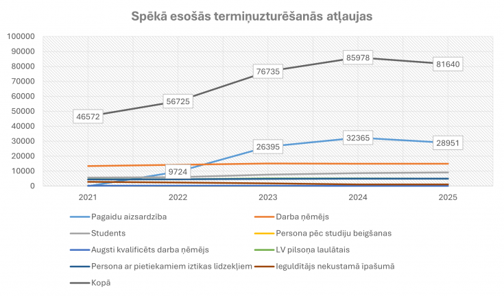 Laikā pēc 2022. gada, lielākā daļa termiņuzturēšanās atļauju pirmreizēji izsniegtas pagaidu aizsardzības nolūkos Ukrainas civiliedzīvotājiem, mazāku daļu sastādot darba ņēmējiem un studentiem. Iemesli pirmreizēji izsniegto termiņuzturēšanās atļauju dinamikai redzami grafikā nr. 2. Lai gan pēdējo 8 gadu laikā trešo valstu pilsoņu studentu skaita dinamika ir pieaugoša,[10] lielākais skaits pirmreizēji izsniegto un spēkā esošo termiņuzturēšanās atļauju (grafiks 2., 3.) izsniegts Ukrainas civiliedzīvotājiem pēc Krievijas pilna mēroga iebrukuma Ukrainā.
