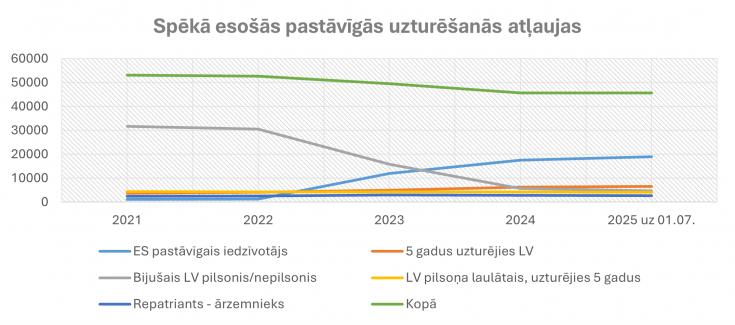 Pastāvīgo uzturēšanās atļauju skaits pēdējo 10 gadu laikā saglabājies stabils, ar tendenci samazināties (grafiks nr. 1). Detalizēti aplūkojot spēkā esošo pastāvīgo uzturēšanās atļauju izsniegšanas iemeslus redzams, ka palielinājies personu skaits ar Eiropas Savienības (ES) pastāvīgā iedzīvotāju statusu, un to personu skats, kas 5 gadus uzturējušās Latvijā. Samazinājums ir bijušo Latvijas pilsoņu/nepilsoņu kategorijā (grafiks nr. 4).