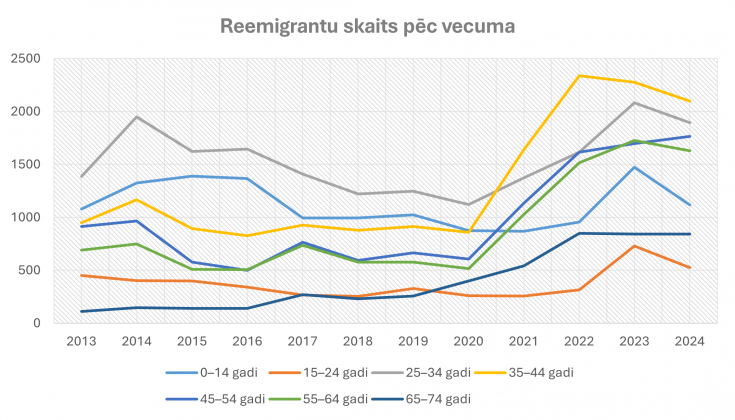 Pēdējo 10 gadu laikā pieaudzis reemigrantu skaits. Izteikts pieaugums vērojams vecuma grupā no 35-44. Dati rāda, ka lielākā daļa reemigrantu ir darbspējas vecumā, taču būtiska daļa ir arī obligātās izglītības vecumā (sk. grafiku nr. 9). Vadoties pēc Latvijas Bankas secinājumiem, reemigrantu zināšanas un pieredze var pozitīvi ietekmēt vietējo uzņēmumu produktivitāti, taču daži no izaicinājumiem saistīti ar zemāku ekonomisko aktivitāti, salīdzinājumā ar vietējiem iedzīvotājiem.[13]