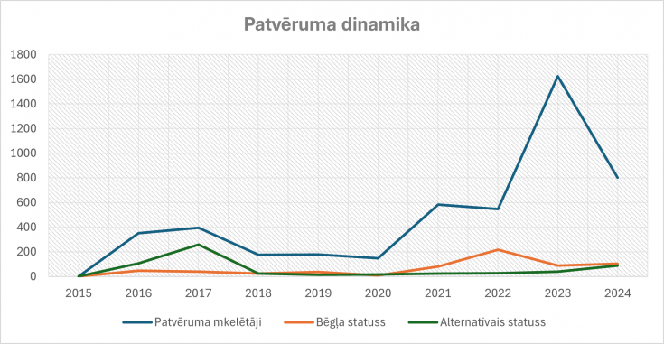 Grafiks nr. 7. Patvēruma dinamika 2015-2024. Avots: Pilsonības un migrācijas lietu pārvalde. Pieejams: https://www.pmlp.gov.lv/lv/patveruma-mekletaju-statistika