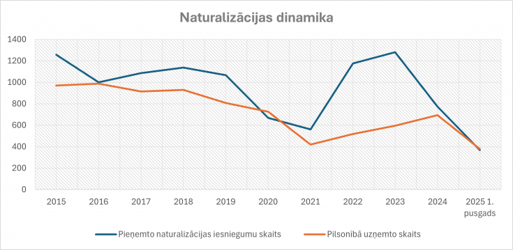Pretstatot 2015. un 2024. gadu, samazinājies pieņemto naturalizācijas iesniegumu skaits, taču dinamikā vērojams pieaugums posmā no 2017.-2018. g. un posmā no 2022.-2023. g. Pilsonībā uzņemto skaits arī ir ar lejupejošu tendenci, kur pieaugumu iespējams novērot 2024. gadā.