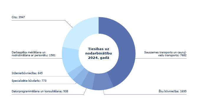 Grafiks nr. 6. Trešo valstu pilsoņu nodarbinātība nozarēs 2024. g. Avots: Eiropas migrācijas tīkla Latvijjas kontaktpunkts. Siliņa-Osmane, I., Ieviņa, I. (2025). Par migrācijas un patvēruma situāciju Latvijā 2024. Gadā. Pieejams: https://www.emn.lv/eiropas-migracijas-tikls-publice-patveruma-un-migracijas-parskatu-par-2024-gadu/