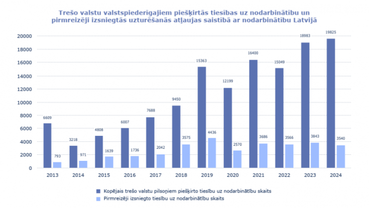 Grafiks nr. 5. Trešo valstu pilsoņiem piešķirtās tiesības uz nodarbinātību, skaits. Avots: Eiropas migrācijas tīkla Latvijjas kontaktpunkts. Siliņa-Osmane, I., Ieviņa, I. (2025). Par migrācijas un patvēruma situāciju Latvijā 2024. Gadā. Pieejams: https://www.emn.lv/eiropas-migracijas-tikls-publice-patveruma-un-migracijas-parskatu-par-2024-gadu/