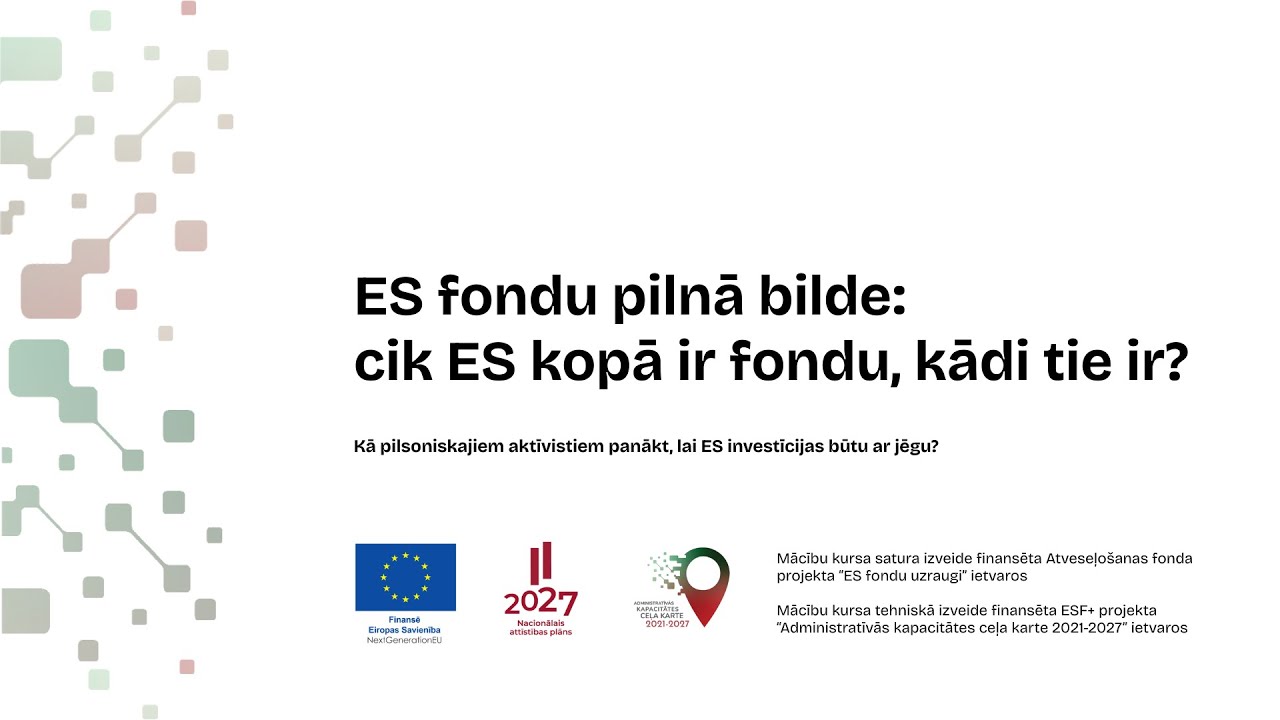 1. ES fondu pilnā bilde: cik ES kopā ir fondu, kādi tie ir? Šī ievadnodarbība sniedz vispārēju priekšstatu par ES fondu sistēmu, skaidrojot atšķirības starp dažādiem fondiem un to pārvaldības veidiem. Jūs uzzināsiet par ES daudzgadu budžetu, Atveseļošanās fondu un galvenajiem Kohēzijas politikas fondiem, kas tiek administrēti Latvijā, kā arī par to, kādi ir galvenie jautājumi, kas jānoskaidro aktīvistam, lai sāktu orientēties ES naudas apritē un tās uzraudzības iespējās.